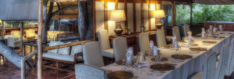 The main lodge’s unique tree house made of a multi-tiered, raised dining/lounge area under canvas, set amongst the shade of ebony and mangosteen, complements the atmosphere of this original safari camp.